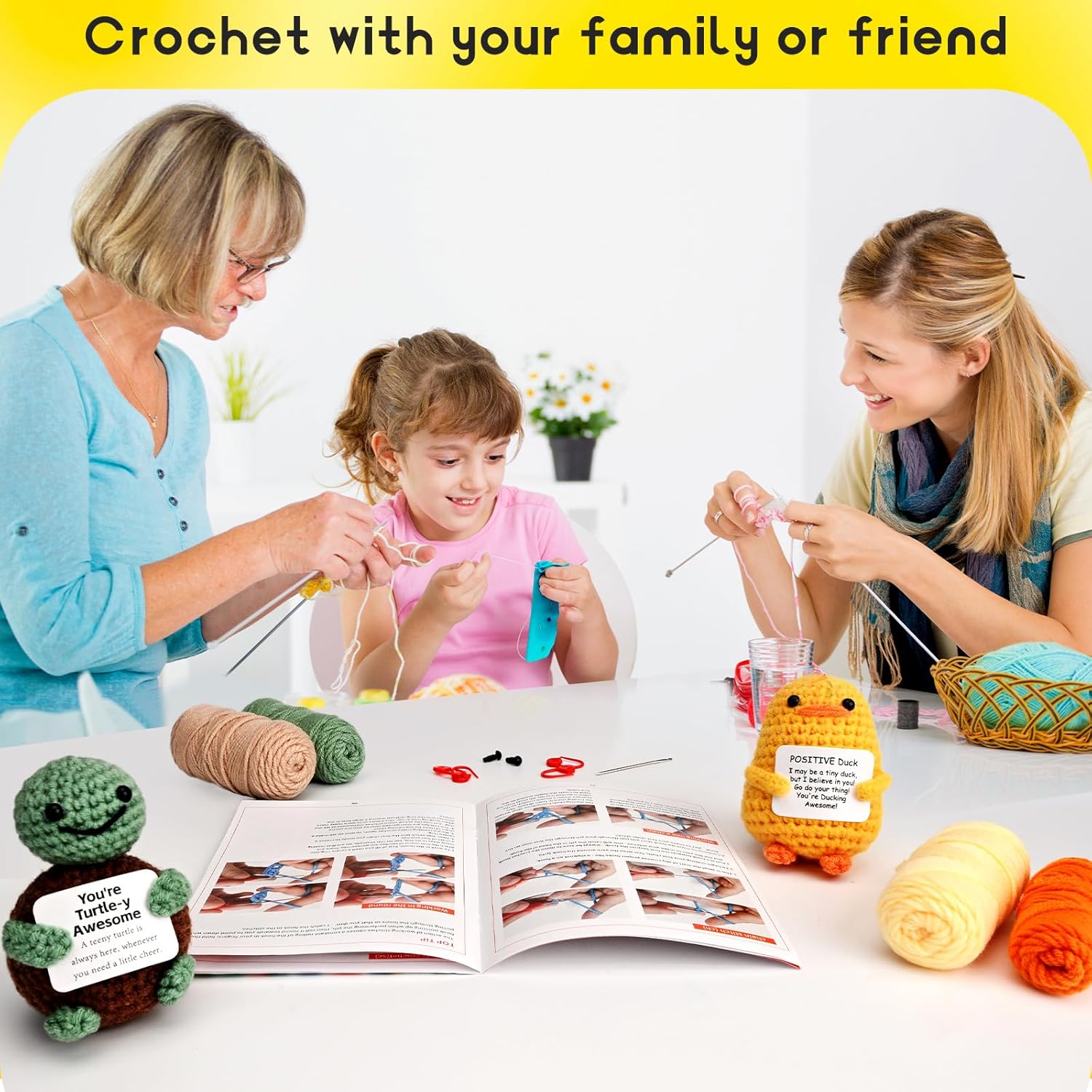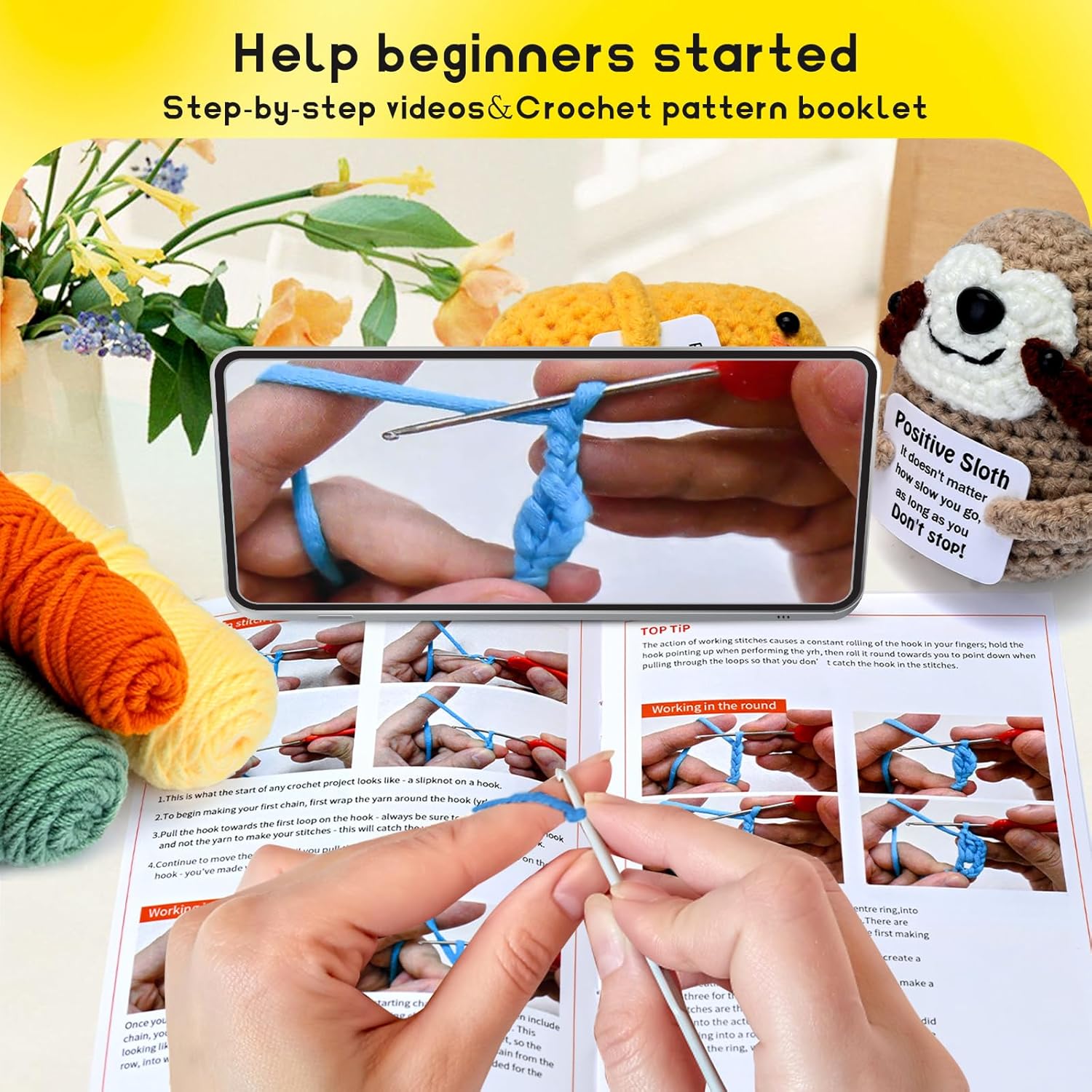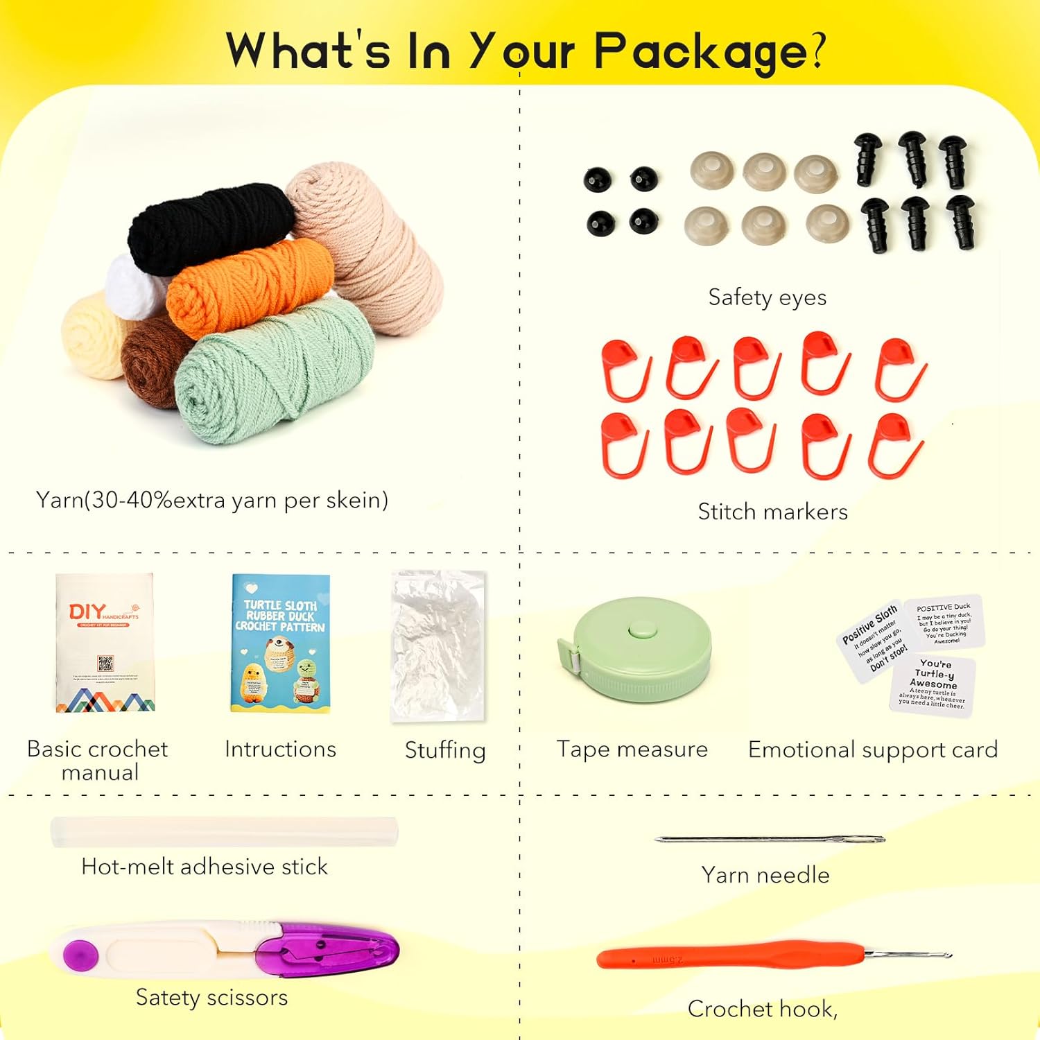 - Mukana kaikki kuvissa näkyvät tarvikkeet ja langat